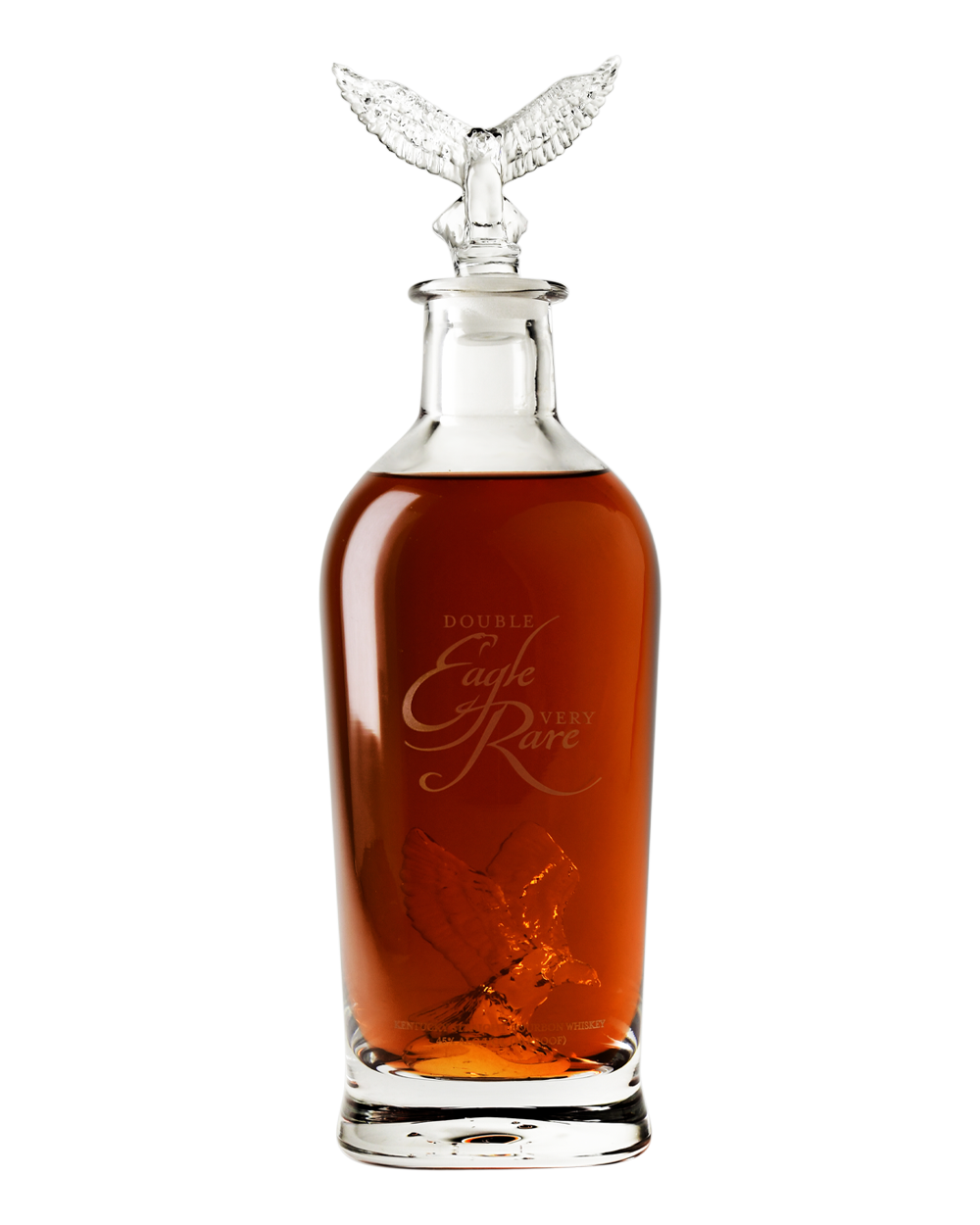 The Double Eagle Very Rare is the epitome of luxury and sophistications. The iconic two beautifully-sculpted crystal glass eagles in the Double Eagle decanter symbolizing the bourbon's heritage and craftsmanship. The clear sculpted crystal, harmonizes beautifully with the rich amber hue of the bourbon, suggesting a luxurious experience for connoisseurs who appreciate historical significance and refined taste.