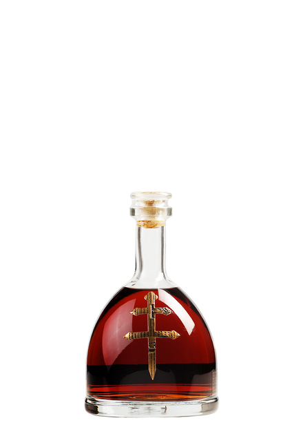 The Dusse XO bottle is a masterpiece of modern design, featuring a sleek, black crystalline glass that conveys an aura of sophistication and mystery. The iconic Dusse Cross, meticulously engraved in silver, serves as the bottle’s centerpiece, symbolizing the brand’s heritage and craftsmanship. This bottle is tailored for those who seek a premium experience, offering a deep, intense cognac aged to perfection. The minimalist design and the dark hue enhance the anticipation of the exquisite spirit within.