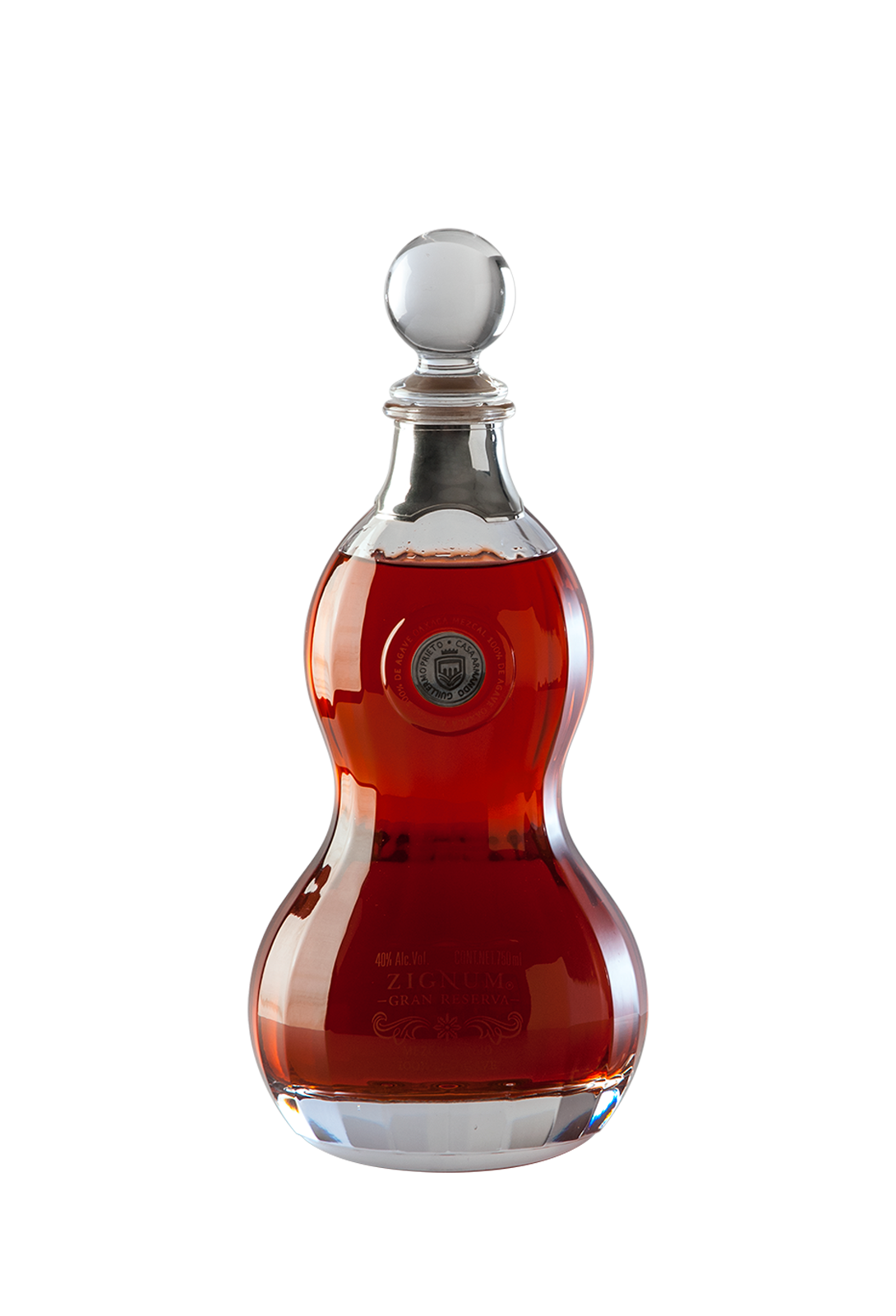 The Zignum Gran Reserva bottle is a masterpiece of contemporary design, reflecting luxury and sophistication. Its unique shape and flawless execution make it a distinctive addition to any premium collection, embodying modern elegance and refinement. The bottle’s voluptuous, curvaceous form perfectly complements the rich mahogany hue of the mezcal within. The narrow neck, adorned with a sleek metallic collar, and the exquisite glass stopper enhance its luxurious appeal.